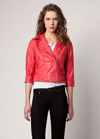 Jaket kulit keluaran brand fashion high street Bershka ini hadir dengan warna merah menyala. Padankan jaket tersebut dengan blouse putih serta celana panjang hitam. Untuk dapat tampil sempurna, lengkapilah penampilan Anda dengan sepatu boots berwarna hitam.